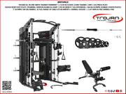 The TRSMFT900 is a manifestation of uncompromising quality, boasting features such as Gun Rack Style Smith Bar Safety’s, Lat Pull down Bars, Magnetic Selector pins, and Sealed Aluminium Bearing Pulleys. Its robust build sustains formidable weights – 550 Lbs for Smith Bar, Long JHooks, and Short JHooks, while Weight Plate storage Pins hold up to 135 Lbs.