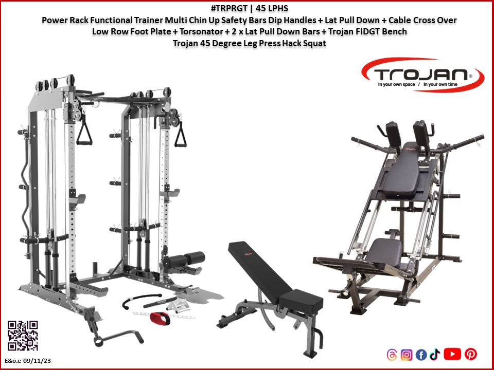 Introducing the new " Trojan Power Rack Cable Cross & Lat Pull down " model , the most complete strength & conditioning training circuit in one machine. Most exercises can be performed with the Trojan TRPC|GT Power Rack. This is a game changer for people with space restrictions & combining all your Cable Work in one machine !