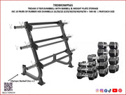 Rubber Hex Dumbbell Rack 3 Tier + Weight Plate & Barbell Storage + 565 Kg Rubber Dumbbells