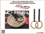A great upper body conditioning package Includes our Wooden Gym Rings & Adjustable numbered straps + Our Trojan 5 Mtr Climbing Rope, with heavy duty Hook & Rubber Gripped end.