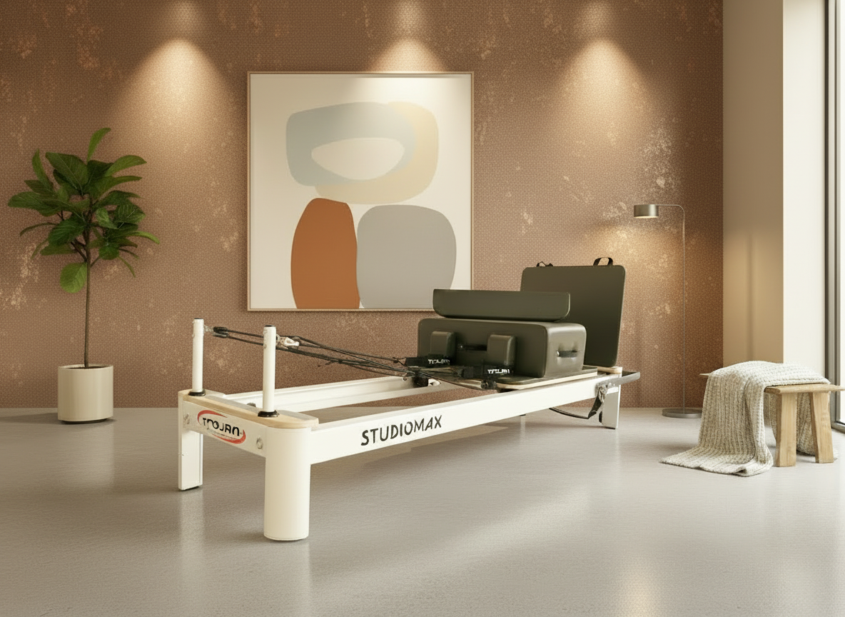 Upgrade your Pilates experience with the TrojanStudio Max Aluminum Reformer, built for stability, durability, and smooth performance. Featuring a sleek aerospace-grade aluminum frame in a crisp white finish, this reformer blends seamlessly into any space while delivering commercial-grade quality.