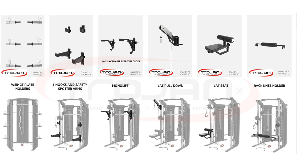 The TRSMFT900 is a manifestation of uncompromising quality, boasting features such as Gun Rack Style Smith Bar Safety’s, Lat Pull down Bars, Magnetic Selector pins, and Sealed Aluminium Bearing Pulleys. Its robust build sustains formidable weights – 550 Lbs for Smith Bar, Long JHooks, and Short JHooks, while Weight Plate storage Pins hold up to 135 Lbs.