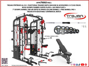 A Masterpiece of Versatility: Standing proudly at H 2167 X W 1936 X D1529, this powerhouse seamlessly integrates the finest features of a Smith Machine, Leg Press Attachment, Power Rack, Squat Rack, Chin-Up Bar, and Functional Trainer Cable Cross Over—all in one sleek unit.
