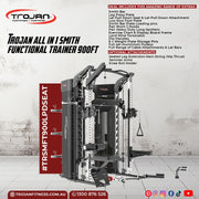 The TRSMFT900 is a manifestation of uncompromising quality, boasting features such as Gun Rack Style Smith Bar Safety’s, Lat Pull down Bars, Magnetic Selector pins, and Sealed Aluminium Bearing Pulleys. Its robust build sustains formidable weights – 550 Lbs for Smith Bar, Long JHooks, and Short JHooks, while Weight Plate storage Pins hold up to 135 Lbs.