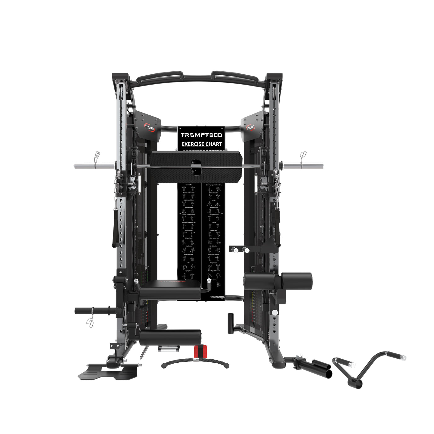 The TRSMFT900 is a manifestation of uncompromising quality, boasting features such as Gun Rack Style Smith Bar Safety’s, Lat Pull down Bars, Magnetic Selector pins, and Sealed Aluminium Bearing Pulleys. Its robust build sustains formidable weights – 550 Lbs for Smith Bar, Long JHooks, and Short JHooks, while Weight Plate storage Pins hold up to 135 Lbs.
