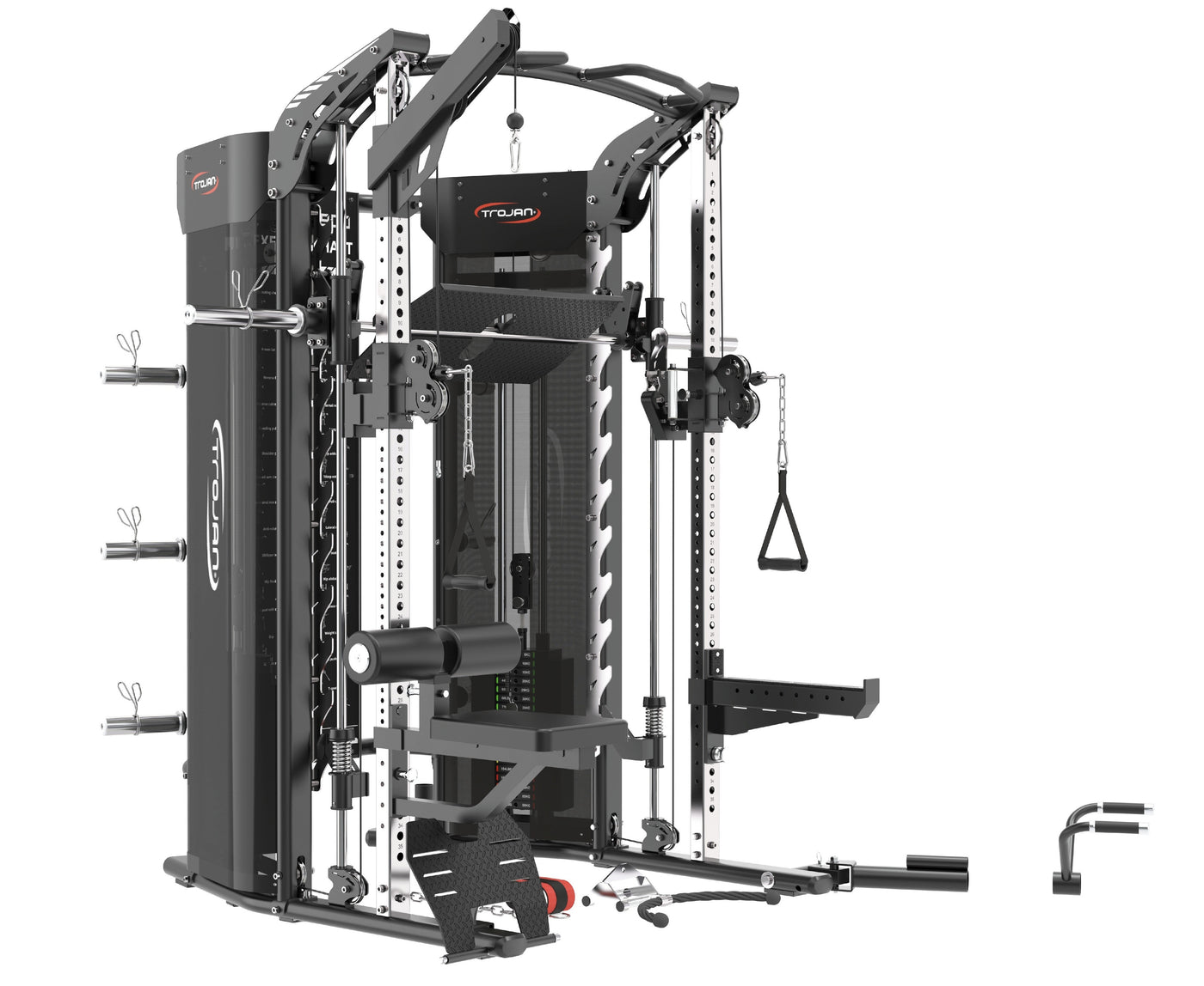 The TRSMFT900 is a manifestation of uncompromising quality, boasting features such as Gun Rack Style Smith Bar Safety’s, Lat Pull down Bars, Magnetic Selector pins, and Sealed Aluminium Bearing Pulleys. Its robust build sustains formidable weights – 550 Lbs for Smith Bar, Long JHooks, and Short JHooks, while Weight Plate storage Pins hold up to 135 Lbs.